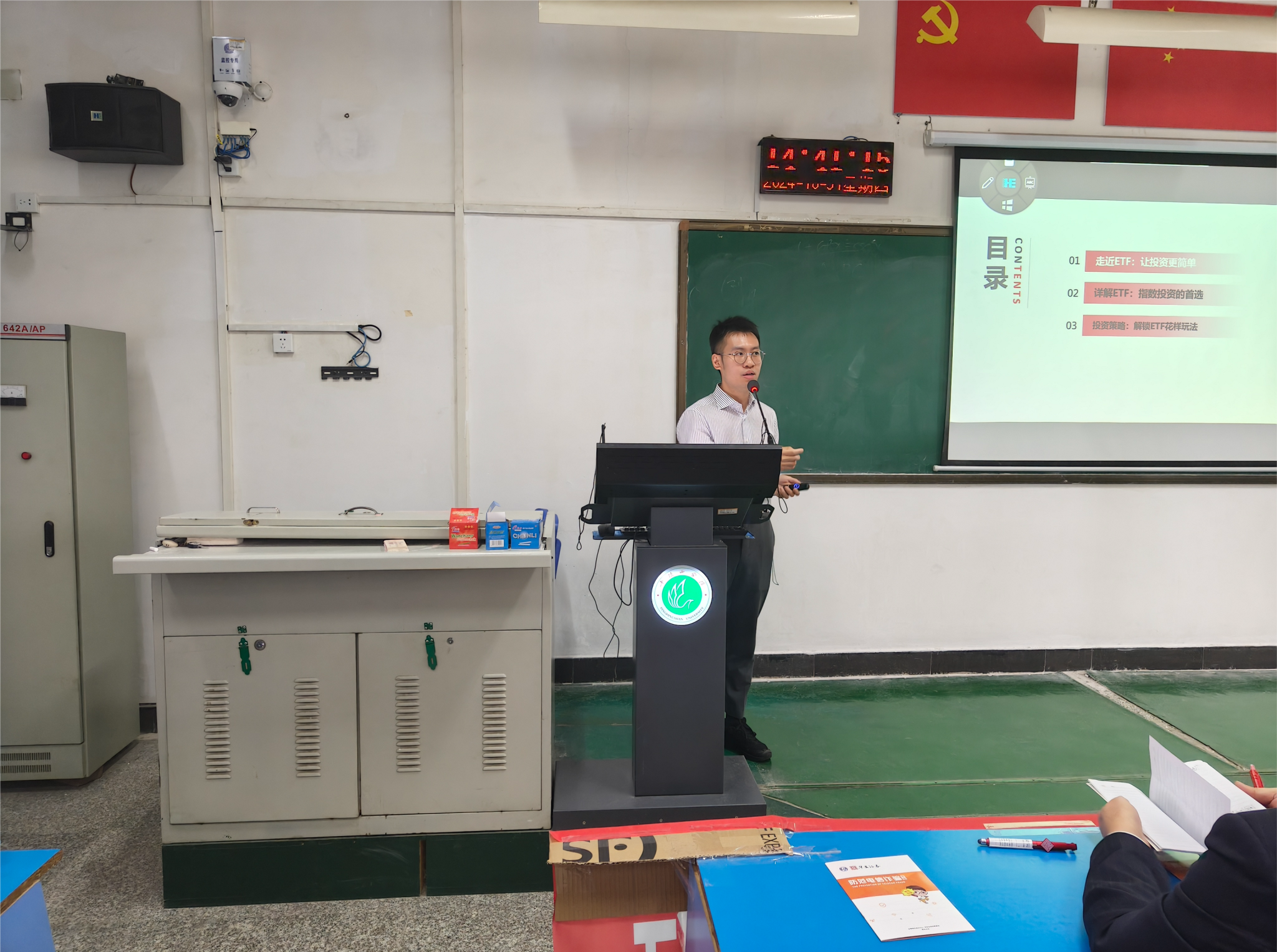 上交所投资者服务部经理叶霄麒以《高质量发展的上交所ETF市场》为主题,深入浅出讲解了ETF的概念,详细介绍了指数股投资的优势及市场概况,并着重对宽基ETF、债券ETF、货币ETF等内容进行了详细的讲解,帮助同学们更好地了解和运用这一重要的金融市场工具。