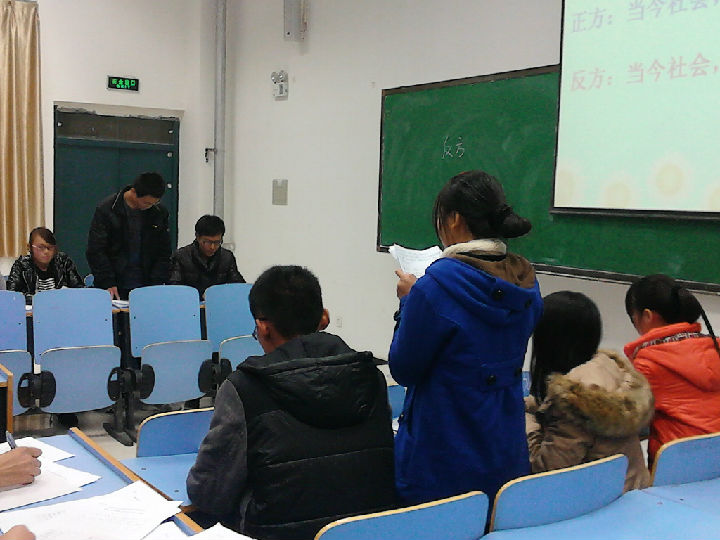 正方、反方进行自我介绍后,辩论进入开篇立论环节,双方更是争锋相对,步步紧逼,现场气氛迅速升温,进入辩论赛的高潮。辩论继续进行,进入自由辩论环节。正方辩手们精辟的措辞,犀利的语言,展现出咄咄逼人的气势。反方辩手也不甘示弱,最后进入总结陈词环节,双方辩手清晰的思路和巧妙的陈词给观众留下深刻印象,顿时教室响起了阵阵掌声。