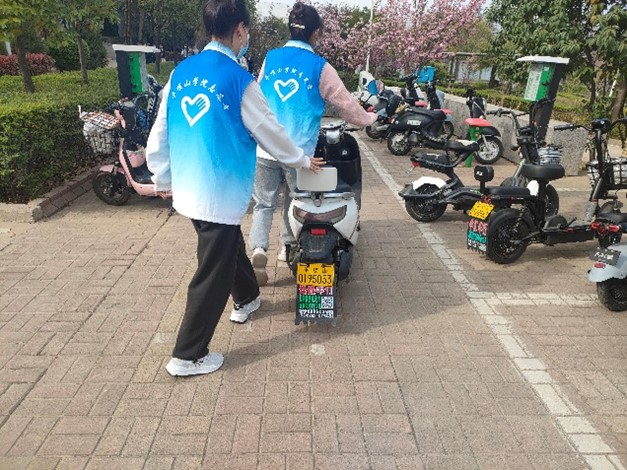 活动过程中,志愿者们分工明确、认真负责,将停放不规范的车辆扶正并摆放整齐。同时,对现场的不规范停车行为进行礼貌纠正,引导同学们把车辆停放在指定的区域。活动中,志愿者们尽职尽责,认真完成电动车的摆放及规范停车理念的宣传工作,充分彰显了当代青年志愿者的青春风采。