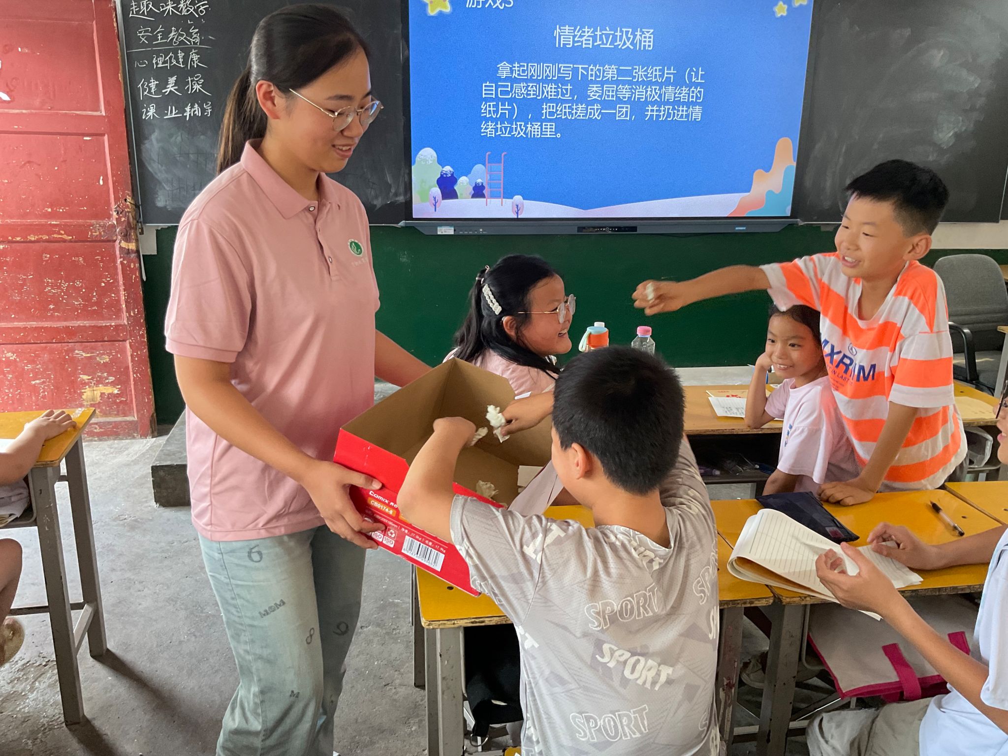 课堂上,志愿者以三个精心设计的小游戏作为活动的开端,点燃了孩子们的热情和参与感。志愿者首先引导孩子们进行“情绪探索”的游戏,鼓励孩子们分别记录下自己开心、幸福、感动的瞬间,以及伤心、难过、愤怒的事情。让孩子们深入探索自己的内心世界,通过文字的形式让情绪变得具体可触。随后,进入“幸福瞬间”环节,志愿者鼓励孩子们勇敢站到台上与大家分享写下的幸福瞬间。一幕幕幸福的重现,不仅加深了孩子们对积极情绪的认识,也让他们深深感受到了情绪的价值。而后,进入第三个小游戏——“情绪垃圾桶”,孩子们将自己的负面情绪“打包”扔进准备好的“情绪垃圾桶”中,教导孩子们要学会主动采取行动,自我调节情绪,以保持心理健康。