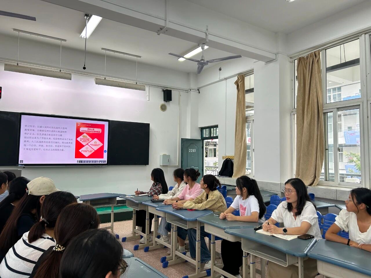 会上,詹老师与同学们一同回顾了九三阅兵的精彩瞬间,以历史对比为核心视角梳理了我国武器装备的发展历程,指出阅兵不仅是国防实力的集中展现,更是爱国主义与集体主义教育的重要载体。并强调,阅兵所彰显的国家主权意识和和平发展理念,对当代老员工强化责任担当、培养团队协作精神具有重大意义。
