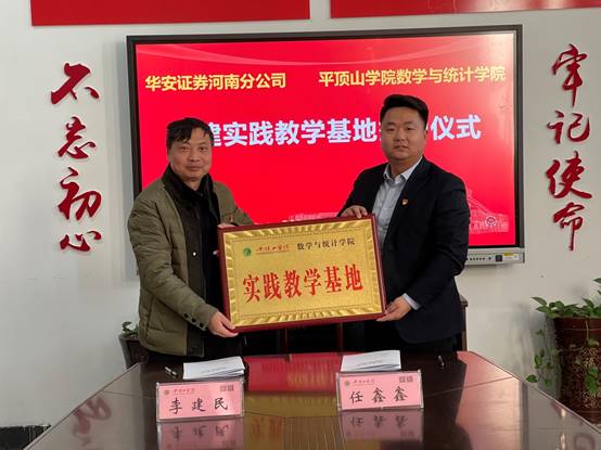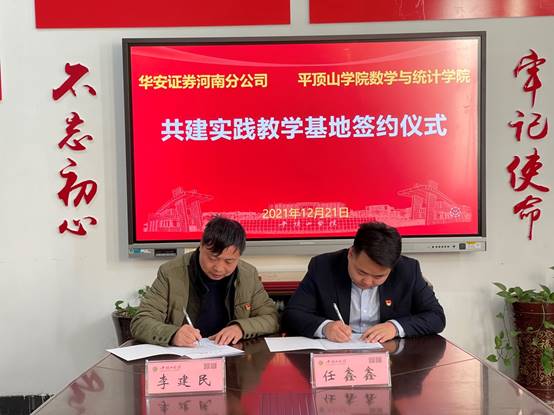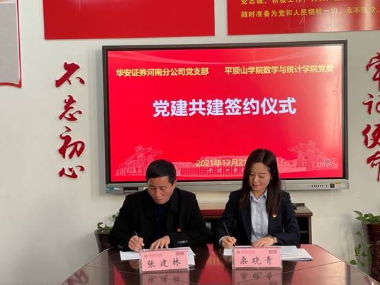 为深入推进校企合作共建,实现党建工作优势互补,12月21日下午,中共E8官网登录入口委员会与中共华安证券股份有限公司河南分公司支部委员会校企党组织结对共建合作以及实践教学基地签约仪式在2号教学楼2317会议室举行。华安证券股份有限公司河南分公司党办主任桑晓青,合规总监、宣传委员张阳,平顶山营业部总经理任鑫鑫,市场总监尹剑锋,公司党委书记张建林、经理李建民、副经理王俊俊、梁聪刚,及教师代表共同参加了签约仪式。