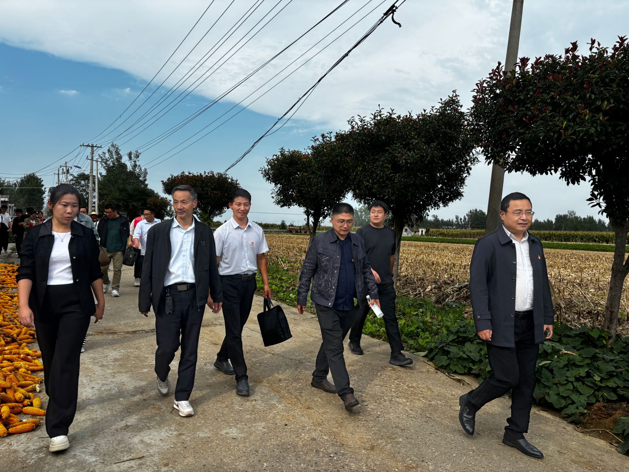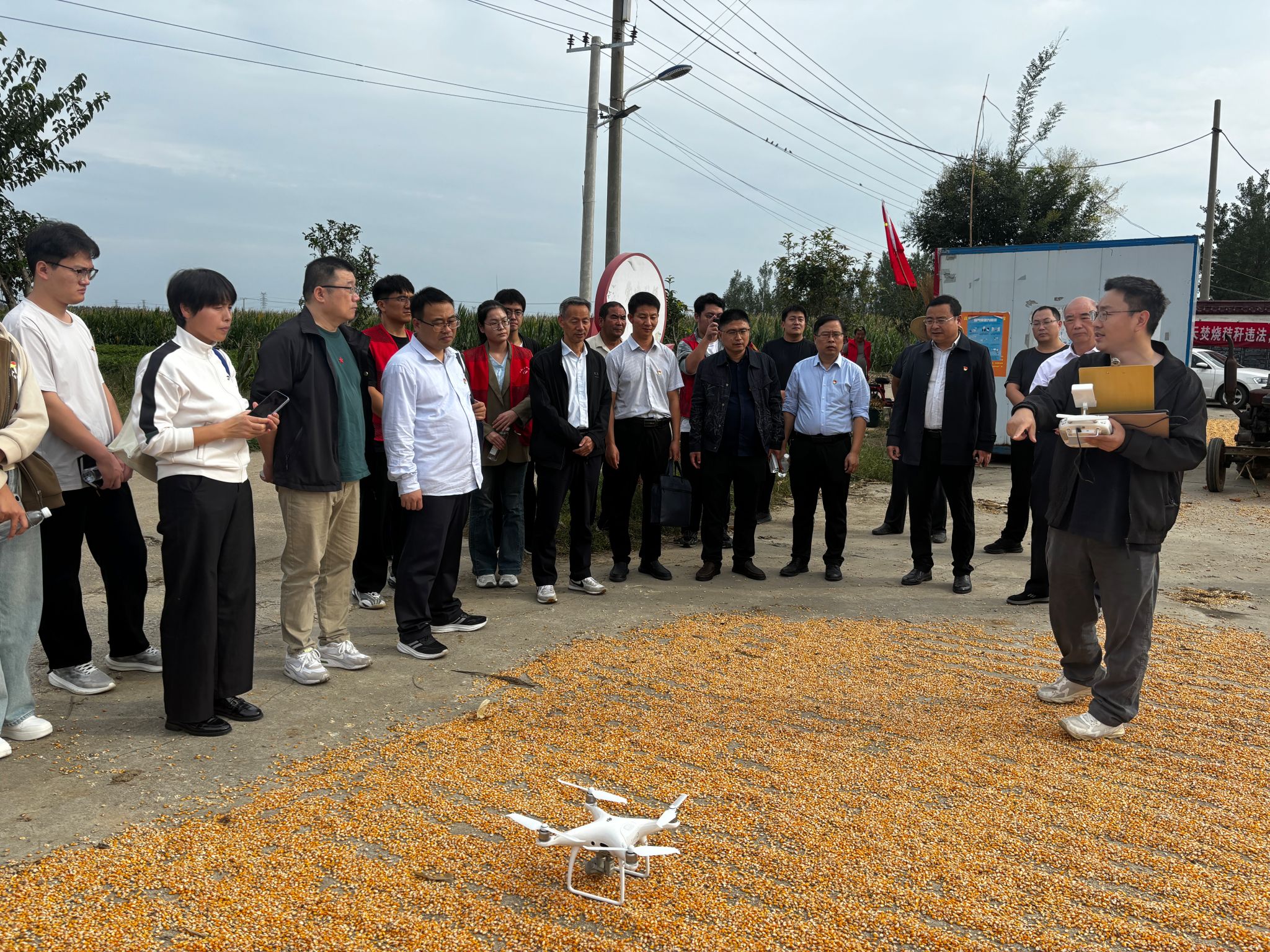 座谈会后,双方共赴叶县东寨村开展实地调研。先是由负责农业统计调查的工作人员向大家详细讲解抽样调查在地块选取中的应用,以及无人机遥感技术在对农作物-玉米进行地块测量、产量预测中的应用。然后,工作人员现场示范了通过无人机等设备获取农作物种植面积的过程。接下来,在丰收在望的田野上,工作人员又带领大家共同体验了农业统计调查中产量测算的详细流程。在样本田里,首先测定3.3米X10市尺的一垄玉米并进行收割,并将收割的玉米统一换算为国家规定的 “标准含水量” 下的产量,再根据该占地面积下的收成换算出成亩产。师生党员们深入田间地头,在沉浸式体验中深刻感悟到“数出有源、据出有据”的专业精神,也对“把论文写在祖国大地上”的实践要求有了更为真切的理解,同时,也真切感受到了先进的无人机技术和测湿技术带来的便捷与高效。