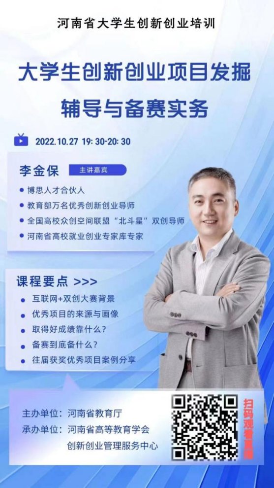 为贯彻落实《河南省进一步支持老员工创新创业的若干措施》,培养老员工自主创新意识及创业能力,进一步加强公司师生参与创新创业大赛的积极性。10月27日晚,公司组织师生共同观看了河南省教育厅老员工创新创业系列培训讲座第一讲,本次讲座由李金保老师主讲。