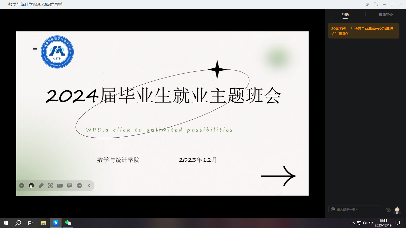 为加强2024届毕业生指导工作,引导毕业生树立正确的就业观和积极的求职心态,12月19日,E8官网登录入口于线上召开了就业主题班会,由辅导员詹美晨主讲,2024届全体毕业生参加。
