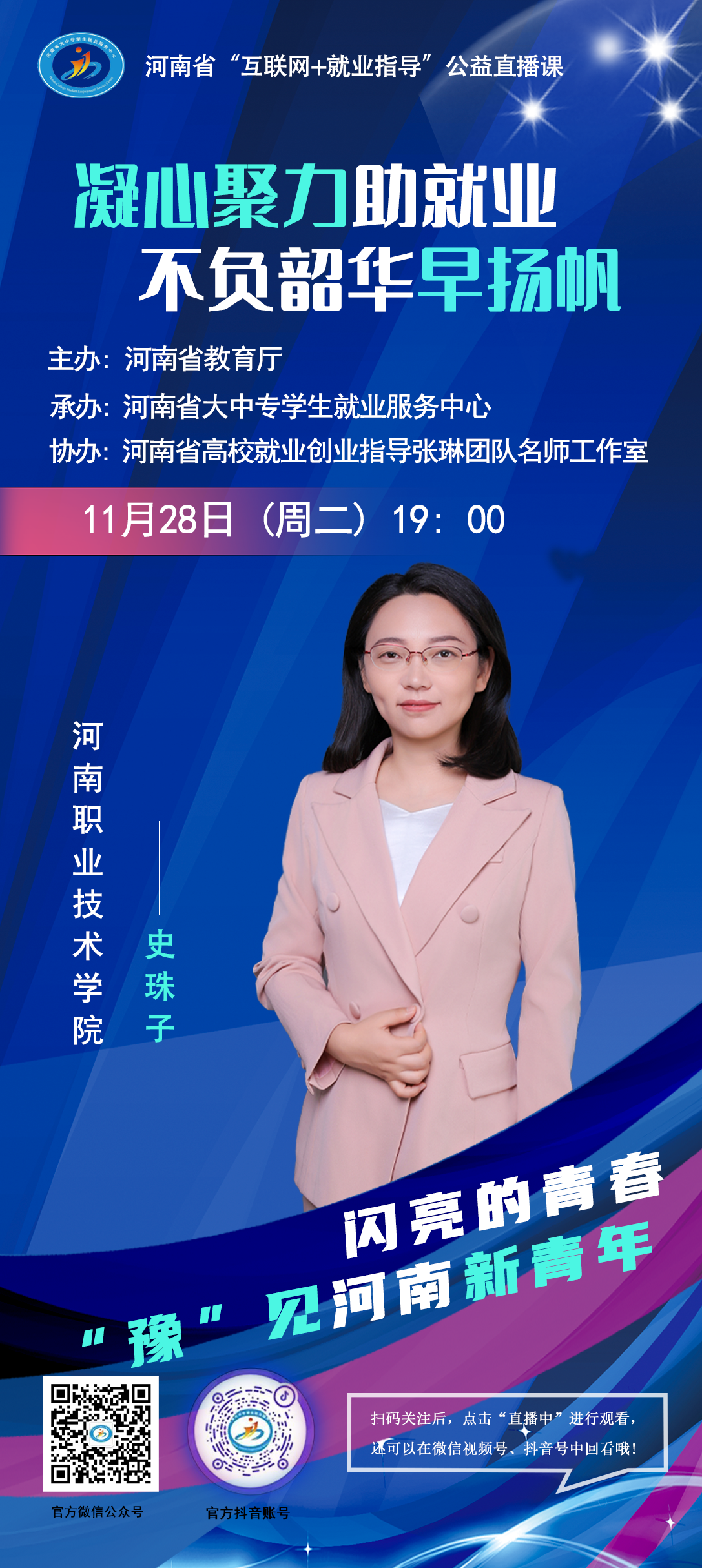 11月28日,公司组织员工线上观看“互联网+就业指导”第三期公益直播课。本次直播晚上7点开始,直播课程由河南职业技术公司教师史珠子开讲,为同学们讲述了老员工就业的基本权益和求职过程中可能会出现的陷阱,最后对于即将就业的员工提出三点建议:首先要树立正确的就业观,其次要心怀梦想、脚踏实地,最后要学会用法律的武器保护自己。