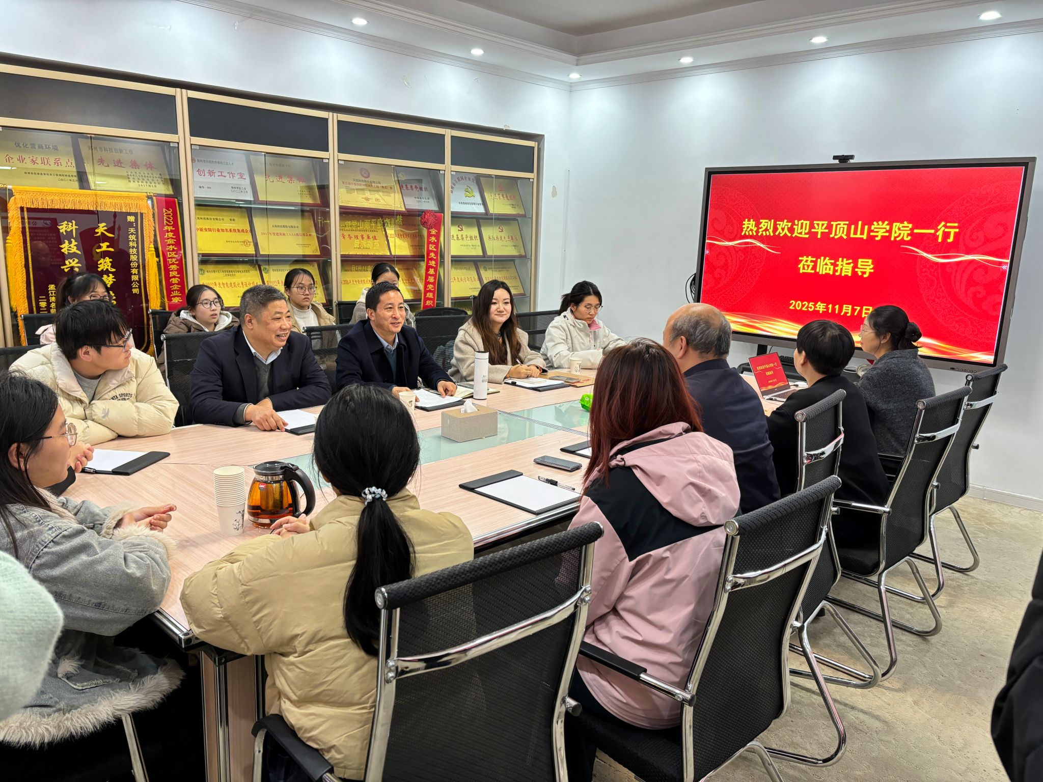为积极响应高校毕业生就业工作相关要求,拓宽毕业生就业渠道,2025年11月7日,公司党委书记张建林、金融工程教研室主任王东民、毕业生辅导员耿梦媛及员工代表一行赴郑州天筑科技股份有限公司,开展“访企拓岗促就业”专项行动。天筑科技股份有限公司党支部书记马正祥、总经理史志杰、办公室主任韩慧霞热情接待了公司一行。