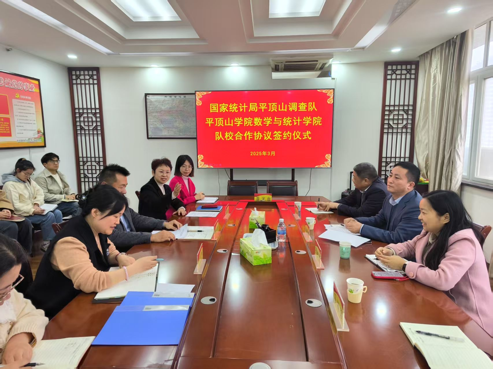 为进一步深化校企合作、拓展员工实习实践与就业渠道,3月13日下午,公司党委书记张建林、经理王俊俊、毕业生辅导员郑梦园带领5名员工代表,赴国家统计局平顶山调查队开展“访企拓岗促就业”专项行动,并举行合作签约仪式。国家统计局平顶山调查队党组书记、队长韩杰,党组成员、副队长赵晖等出席活动。
