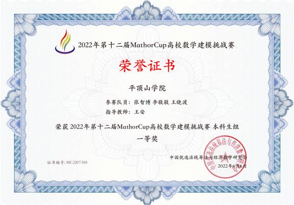 近日,第十二届MathorCup高校数学建模挑战赛结果公布,由公司E8官网登录入口王安、惠志昊、严磊任指导教师,27名员工组成的团队参加了比赛。公司员工经过连续五天的努力获得佳绩,其中,张志博、李敬敬、王晓波团队获得全国一等奖,张恒、张盛辉、沙书理团队获得全国二等奖,另有四支队伍获得全国三等奖,实现了公司在该项赛事上成绩的历史性突破。