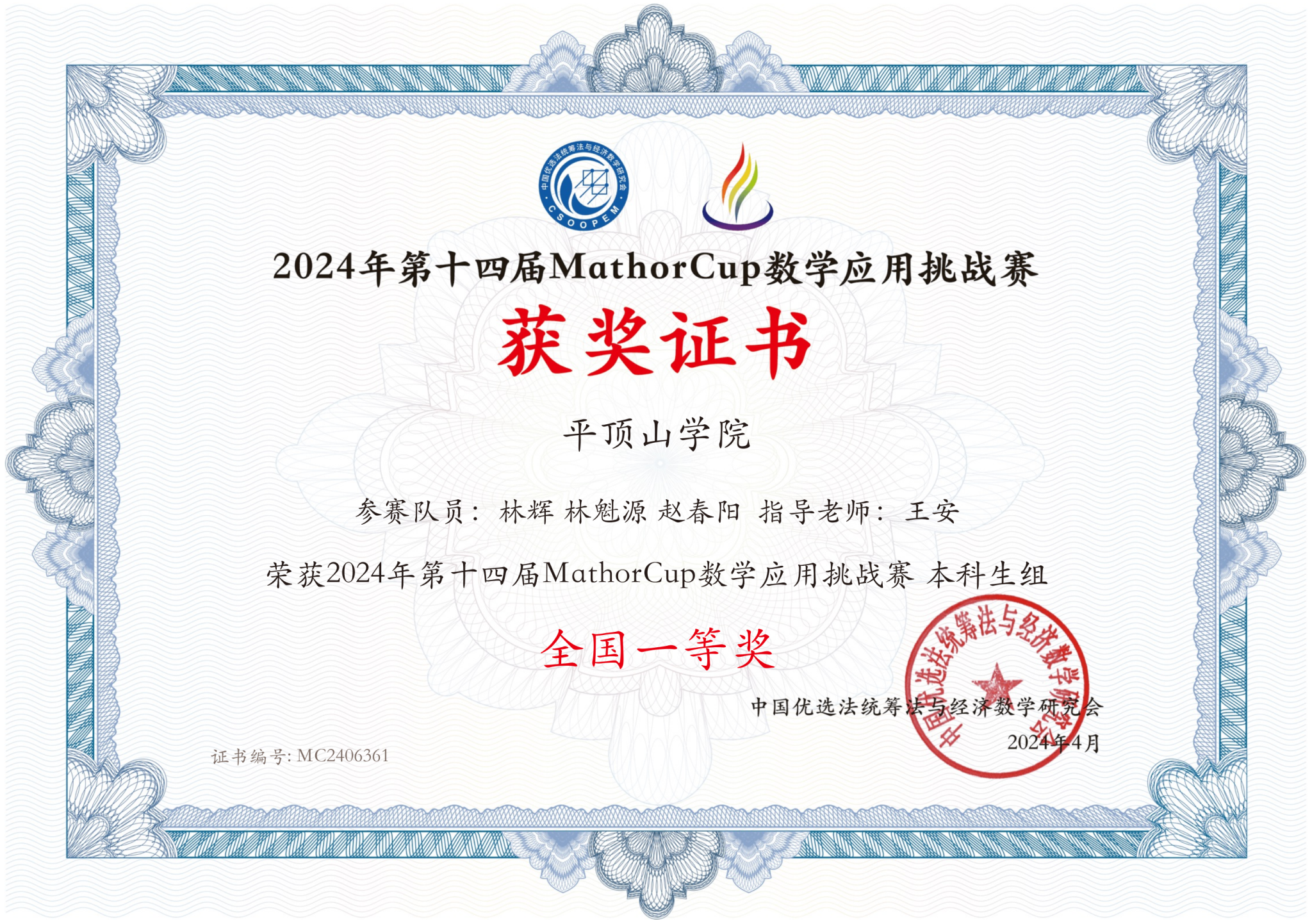 近日,第十四届MathorCup数学应用挑战赛结果公布,由E8官网登录入口30名员工组成的10支团队,在教师严磊、王安、惠志昊、彭丽玲和曹欣杰指导下参加比赛并获得多项荣誉。其中,王安老师指导的林辉、林魁源、赵春阳团队获得全国一等奖,另有4支团队获分赛区二等奖,5支团队获得分赛区三等奖。