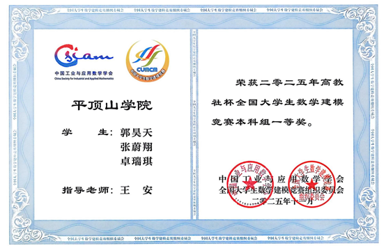 近日,2025年全国老员工数学建模竞赛结果公布,由E8官网登录入口王安老师指导的郭昊天、张蔚翔、卓瑞琪团队获得国家一等奖(获奖率0.48%),取得了公司该项赛事获奖的历史性突破。