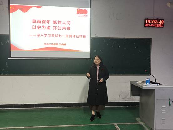 为深入学习贯彻习近平总书记“七一”重要讲话精神,深刻把握重要讲话中蕴含的新思想、新观点、新论断、新要求,切实做到将思想和行动统一到讲话精神上来,10月12日晚,公司组织开展了学习贯彻“七一”重要讲话精神宣讲报告会,信息工程公司党委书记王向前应邀作“风雨百年 砥柱人间 以史为鉴 开创未来”主题报告,全体20级员工参加。