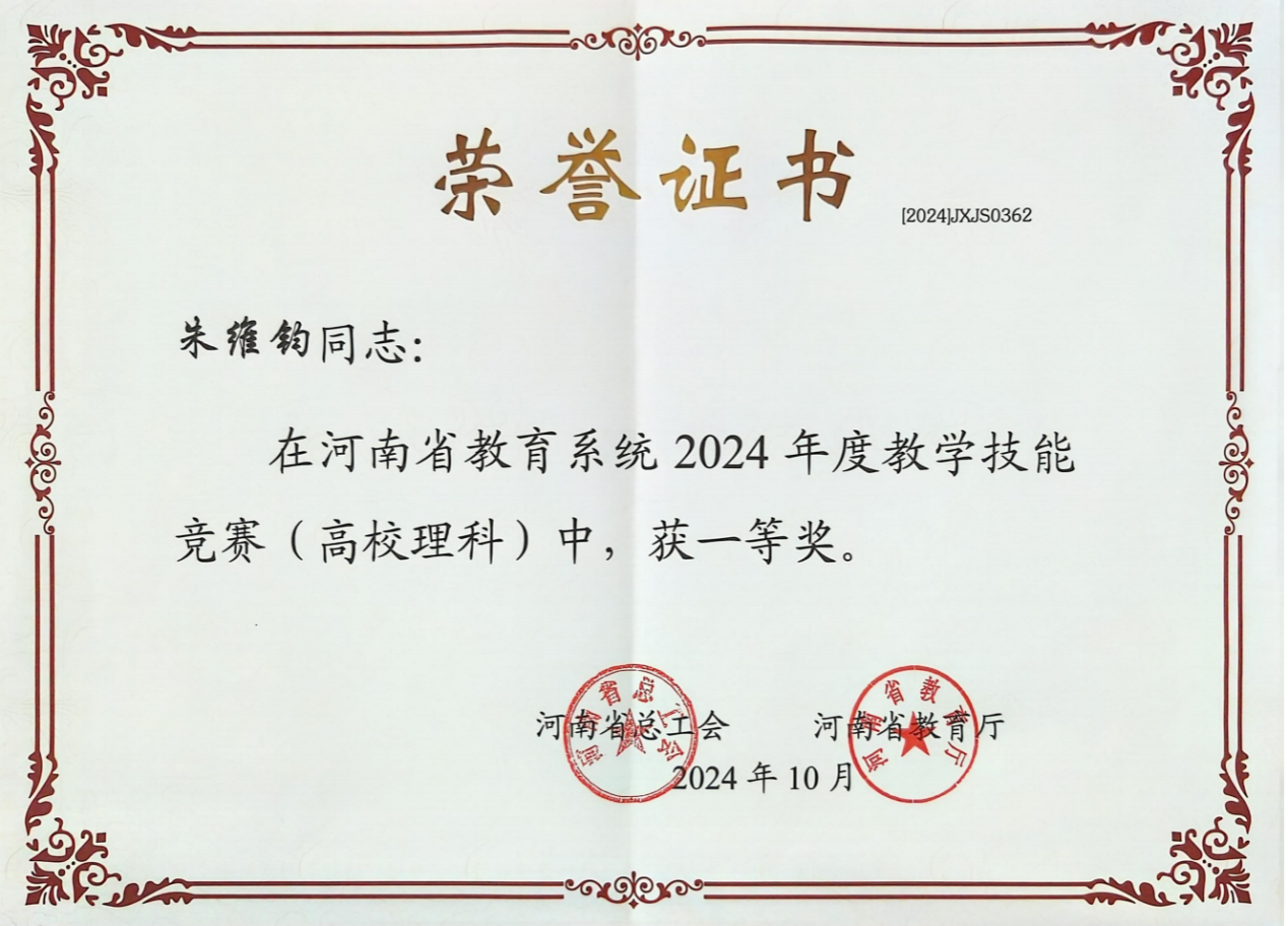 近日,河南省总工会与河南省教育厅共同主办的2024年河南省教学技能竞赛圆满落幕,经过初赛、决赛等环节,公司朱维钧老师从众多参赛教师中脱颖而出,获得高校理科组一等奖,并被授予“河南省教学标兵”荣誉称号,展现了良好的专业素养和较高的教学技能水平。