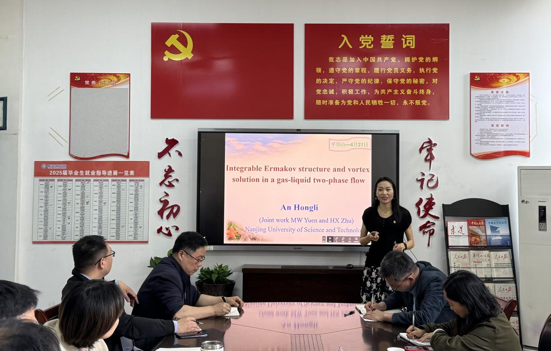 4月21日上午,南京理工大学博士生导师安红利教授在E8官网登录入口2317会议室作了一场主题为“Integrable Ermakoy structure and vortex solution in a gas-liquid two-phase flow ”的学术报告,报告由E8官网登录入口经理王俊俊主持,相关教师参加。