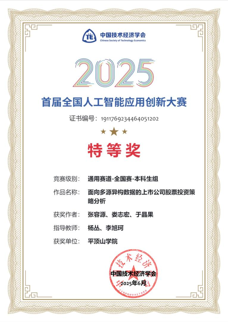 在刚刚落幕的2025首届全国人工智能应用创新大赛全国总决赛中,公司杨丛老师、李旭珂老师指导的张容源、娄志宏、于晶果团队荣获全国特等奖。