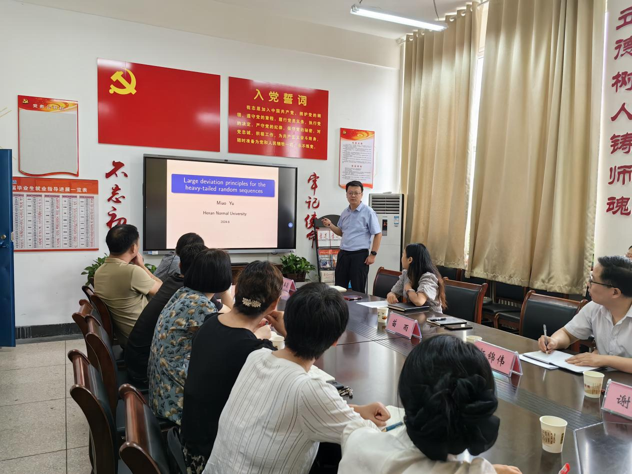 6月28日下午,河南师范大学苗雨教授在E8官网登录入口2317会议室作了一场主题为“Large deviation principles for the heavy-tailed random sequences”的学术报告,报告由E8官网登录入口经理王俊俊主持,统计学教研室相关教师参加。