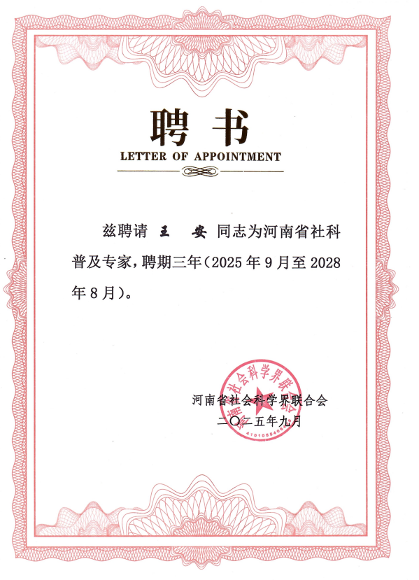 近日,河南省社科联公布《关于聘任河南省社科普及专家(宣讲师)的通知》,公司教师王安副教授被聘为河南省社科普及专家,聘期三年。
